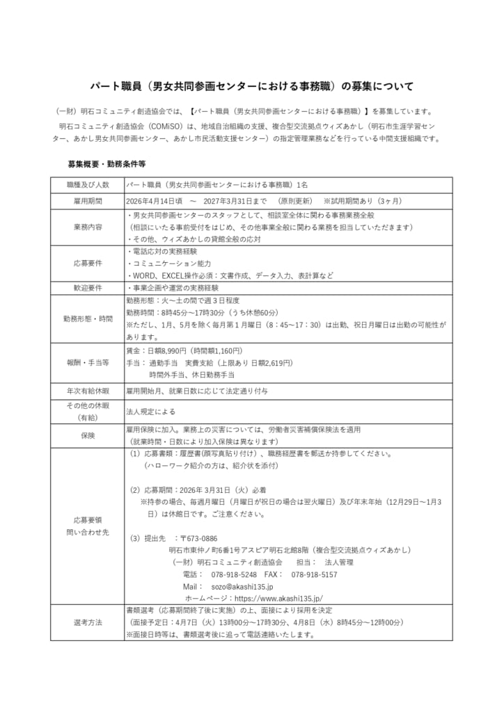 明石コミュニティ創造協会は、一緒に働いてくださる仲間【パート職員(男女共同参画センターにおける事務職)】を募集しています。